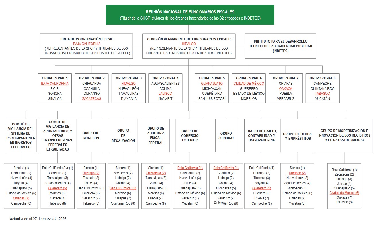 La Reunión Nacional de Funcionarios Fiscales es el órgano máximo del Sistema Nacional de Coordinación Fiscal y se integra por el Secretario de Hacienda y Crédito Público y los representantes de las haciendas públicas de cada una de las 32 entidades federativas. Se reúne por lo menos una vez al año y se copreside por el funcionario de mayor jerarquía de la entidad sede y por el titular de la Hacienda Pública Federal.